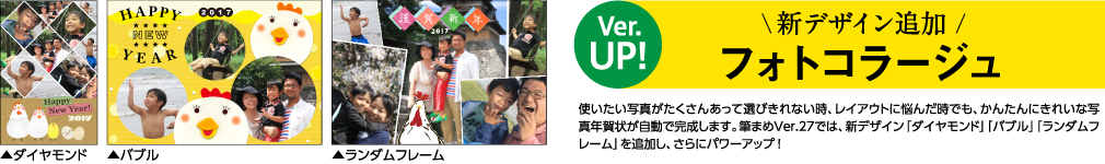 写真を自動レイアウトできる年賀状新デザイン「ダイヤモンド」「バブル」「ランダムフレーム」を追加しました。